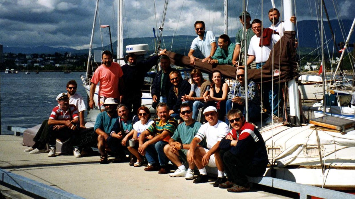Na pokładzie s/y „Varsovia”. Kpt. Tadeusz Jakubowski (Nagroda – Rejs Roku 1994 za opłynięcie świata na s/y „White Eagle”) z żoną, oraz Kpt. Jerzy Łubisz , znany pod pseudonimem „Mrówa” (f/v”Pathfinder III”). Wszyscy mieszkający w rejonie Vancouver.
