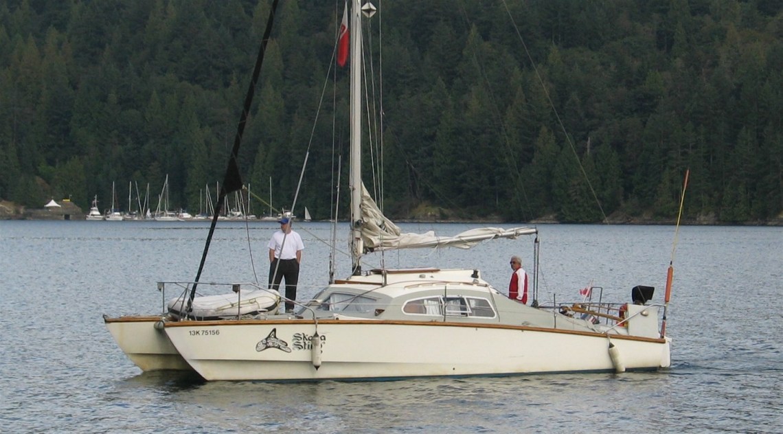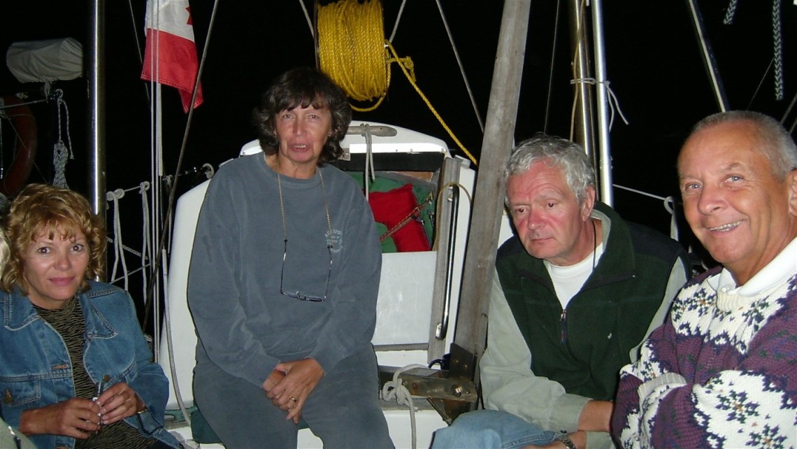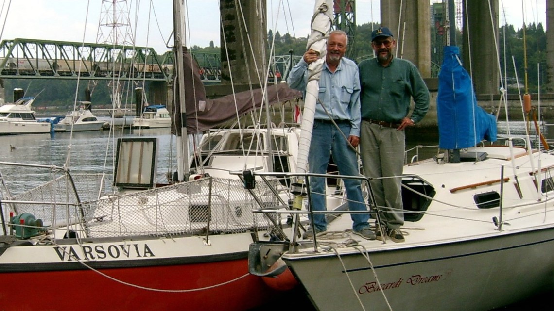 Janek Pietrzak (w czerwonym dresie) później razem z żoną Ewą na innym katamaranie przez 7 lat opłynęli świat: https://jerzykusmider.com/2017/01/31/2017-01-zeglarze-z-vancouver-zakonczyli-rejs-dookola-swiata-nagroda-rejs-roku/