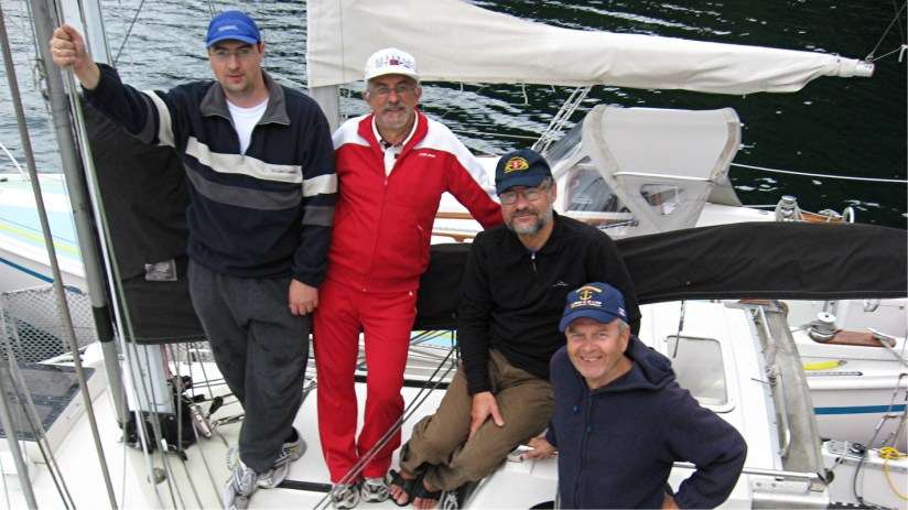 Od lewej: Włodek Szaryk „5 Shilings”, Jerzy Kuśmider „Varsovia” i Michał Jarochowski „Mucho Gusto” (Po śmierci Michała w roku 2007 nowym właścielem jachtu został Rysiek Dolecki, który zwykle przypływał na nasze późniejsze spotkania)