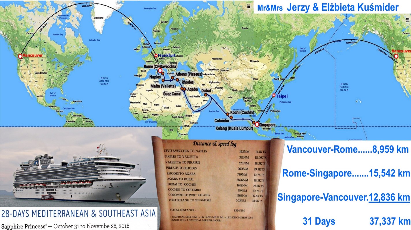To była już moja czwarta podróż Dookoła świata i druga w tym roku. W marcu poleciałem z Vancouver do Polski, ale nie jak zwykle na wschód nad Atlantykiem tylko na zachód przez Pekin. Z Warszawy wróciłem wtedy do domu tradycyjną trasą. W ten sposób straciłem jeden dzień, żeby go odzyskać w październiku znowu ruszyłem w podróż, ale w odwrotnym kierunku. Tym razem z moją żona Elą poleciełem samolotem do Rzymu i dalej z pobliskiego portu Civitavecchia statkiem przez Morze Śródziemne (Włochy, Malta, Grecja), Kanał Sueski, Morze Czerwone, Jordania, Zjednoczone Emiraty Arabskie, Ocean Indyjski, Indie, Sir Lanka i Malezja. Ostatnim portem był Singapuru skąd wróciliśmy samolotem do Vancouver.