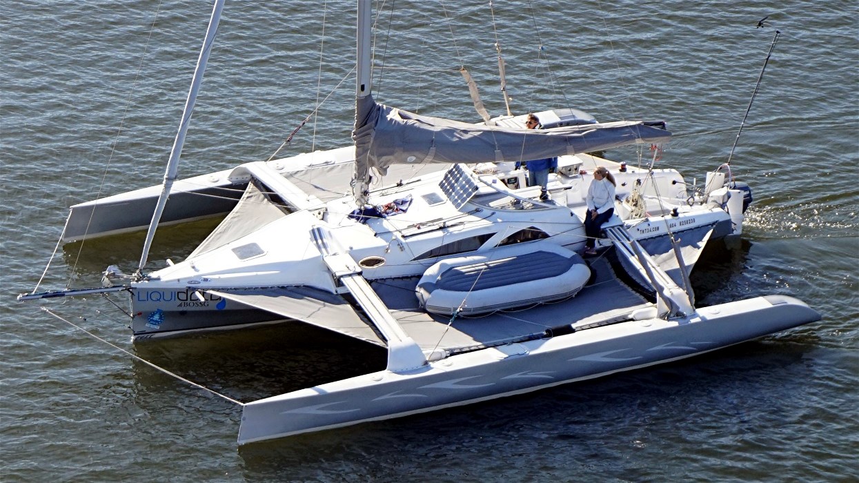 Przede wszystkim szybkość jachtu jest czasami większa niż prędkość wiatru (przez moment osiągnęliśmy 11 węzłów przy bardzo słabym wietrze). W rodzinno-towarzyskich rejsach, jak nie ma wiatru pływa się zwykle na silniku albo pomaga się silnikiem płynąc na żaglach, co jest niemożliwe na takim szybkim trimaranie, bo zaburtowy silnik byłby wyrwany przez opór wody. Dodatkowo bardzo rozbudowane wyposażenie wymaga dobrze przeszkolonej i sprawnej załogi.