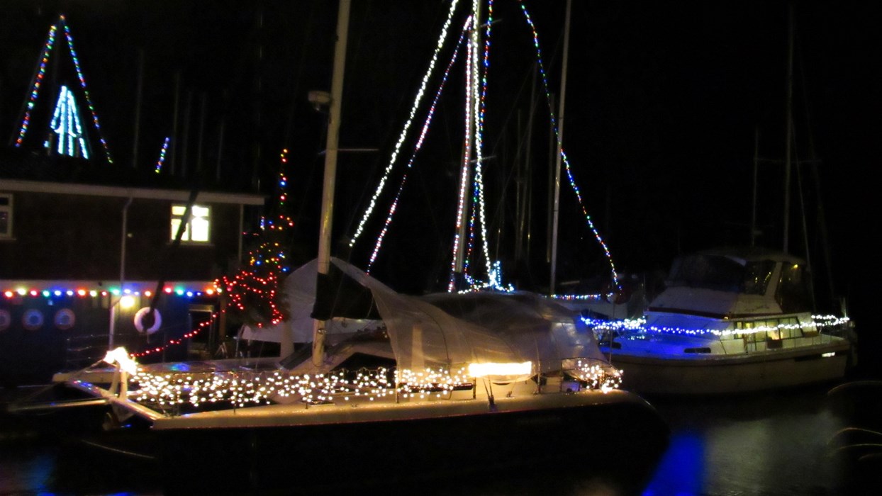 Łódki stojące w marinie są pięknie udekorowane choinkami i światełkami.