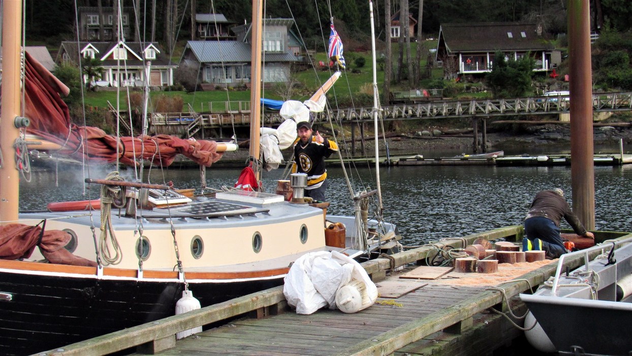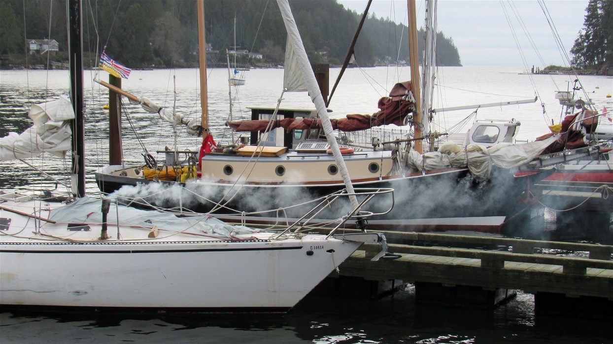 Mają spalinową piłę do cięcia drewna na opał, tak, że ciepło mają za darmo. Za cumowanie pewnie nie płacą, bo zimą stażnik parkowy nie kasuje a po zakupy do pobliskiego miasteczka płyną jak dostaną czek z opieki społecznej. Odwiedzą wtedy również bank żywności i tak życie im płynie, „aby do wiosny”. Jeden z nich opowiadał, że właśnie wybiera się do miasteczka do „Food Bank”, po jedzenie dla pieska. Tak się przygadywał, licząc pewnie, że coś może dostać odemnie. Poprzednim razem jak tu byłem późną jesienią to pytał, czy nie mogę mu dać trochę benzyny do piły tarczowej. Pytanie to było w takiej formie jak bezdomni na ulicy East Hastings w Vancouver pytają o zbywające drobne „spare change”. Powiedziałem, że mam silnik na diesel i temat zamknął się.