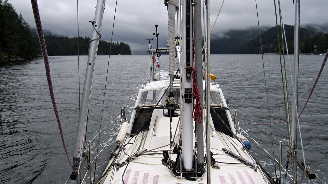 Wreszcie przyszedł czas, żeby wracać do domu. Niestety prognoza wiatrowa na Howe Sound była znowu sztormowa. Wiatr północny 25 do 35 węzłów. W głównym fiordzie dla mnie korzystny, bo z rufy, ale żeby tam dostać się miałem kilka mil pod wiatr. Koło południa miało wiać trochę mniej.
