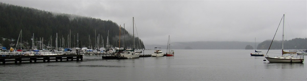Na początek ruszyłem do Indian Arm i zakotwiczyłem w Bedwell Bay gdzie odbywały się liczne spotkania żeglarzy polonijnych z Vancouver. Tym razem w zimowej scenerii wszystko wyglądało inaczej. Na poziomie morza śniegu nie było, ale góry były ośnieżone. Niestety mało widoczne, bo były niskie chmury. Jedynie mogłem powspominać te liczne spotkania towarzyskie.