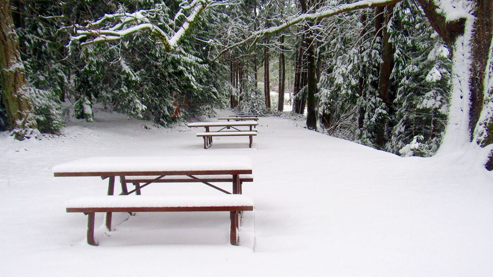 Pólka campingowe przysypane śniegiem czekają na sezon letni.