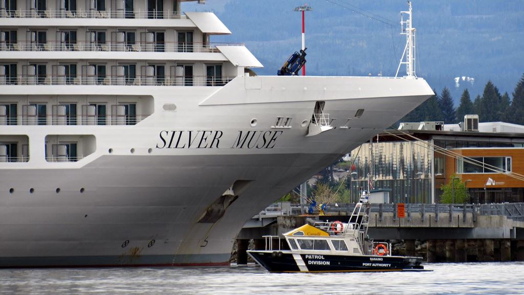 Dla odmiany w porcie Nanaimo stał duży statek pasażerski. Nie typowo, bo zwykle takie wycieczkowce odwiedzały tylko Vancouver. Po dwuletniej plandemicznej przerwie zaczynają przypływać takie statki, ale tylko z reżimom segregacji sanitarnej. Może dlatego portowa motorówka patrolowa bardzo pilnowała takiego statku.