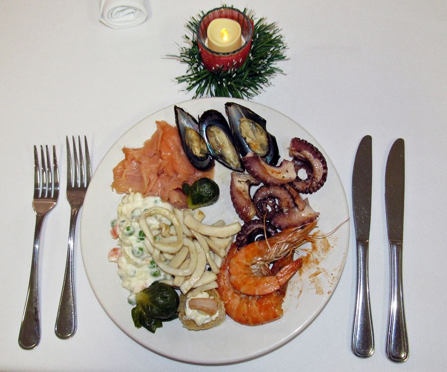 Mój talerz wigilijny wypełniony owocami morza, trochę nietypowymi, jak na polskie warunki, ale tradycyjnie bezmięsne.