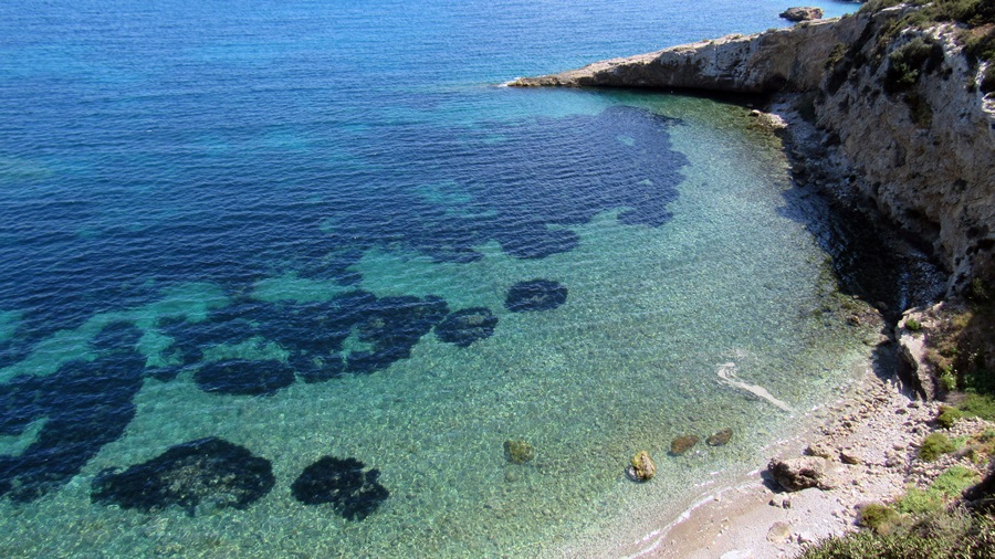 Skaliste brzegi podnóża twierdzy i kontrastują z błękitną przejrzystą wodą.