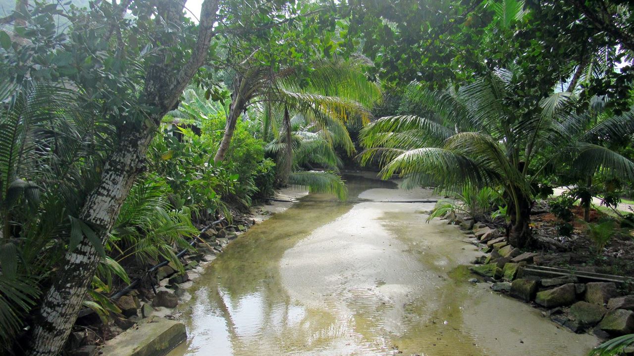 Po drodze mijaliśmy rzeczkę z tropikalną roślinnością nad brzegami. Mała rzeczka, ale pewnie w dużym stopniu zapewnia słodką wodę dla mieszkańców. Generalnie wody tutaj nie brakuje, bo wyspy mają statystycznie duże opady, szczególnie w okresie deszczowym, czyli okresie kiedy odwiedzaliśmy te wyspy.