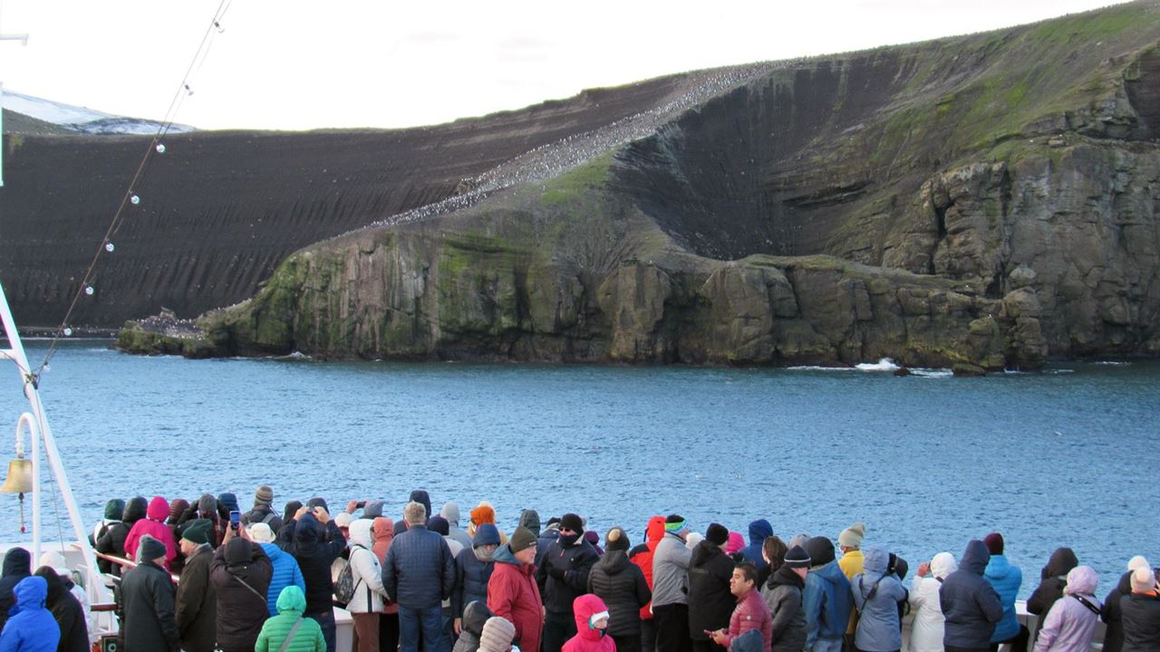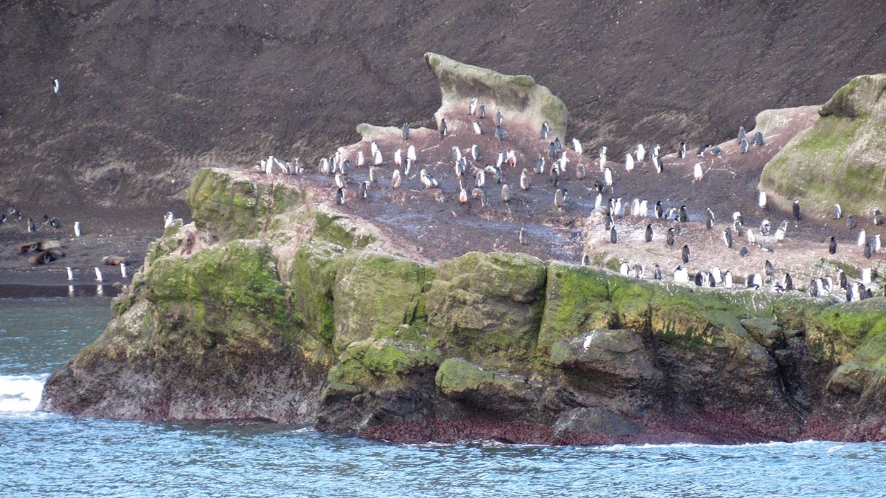 Na Deception Island, są wysokie skały wulkaniczne i olbrzymie ilości pingwinów.