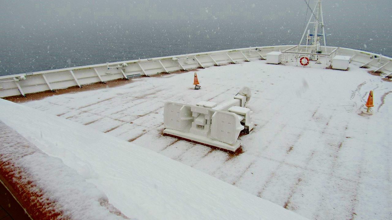 Niestety Charlolotte Bay minęliśmy w gęstej mgle i śnieżycy. Potem trochę się wypogodziło i załoga odśnieżyła pokład na dziobie, skąd jest dobry punkt widokowy.